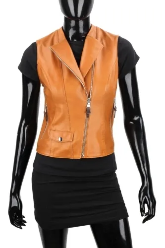 KRY084 - camelowa kamizelka skórzana damska w rockowym stylu DORJAN