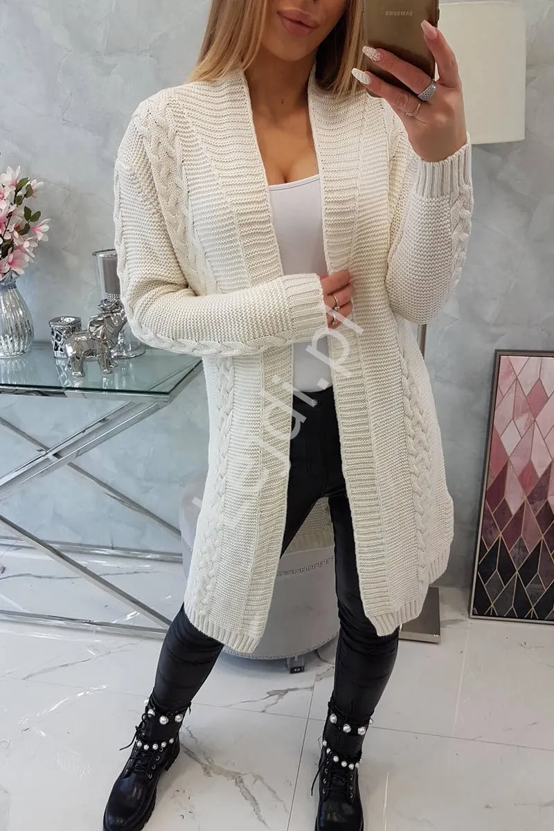 Narzutka swetrowa z warkoczami, wełniany kardigan ecru 2019-01