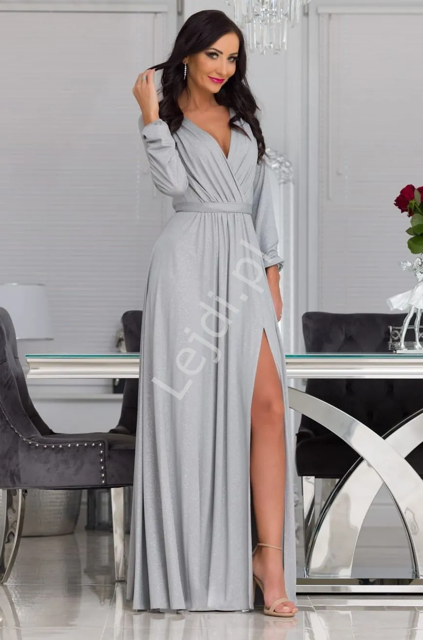 Brokatowa srebrna sukienka z długim rękawem z efektem wow , szara Salma 2
