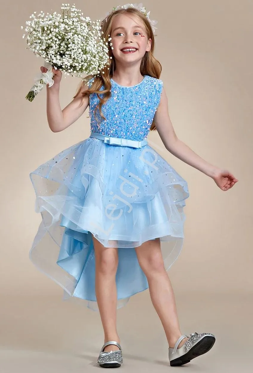 Jasno różowa sukienka z cekinami. Sukienka z tiulowym dołem z gwiazdkami i cekinami. Sukienka wspaniale się prezentuje, pięknie błyszczy. Sukienka idealnie sprawdzi się na przyjęciekomunijne, chrzty, wesele czy urodziny.