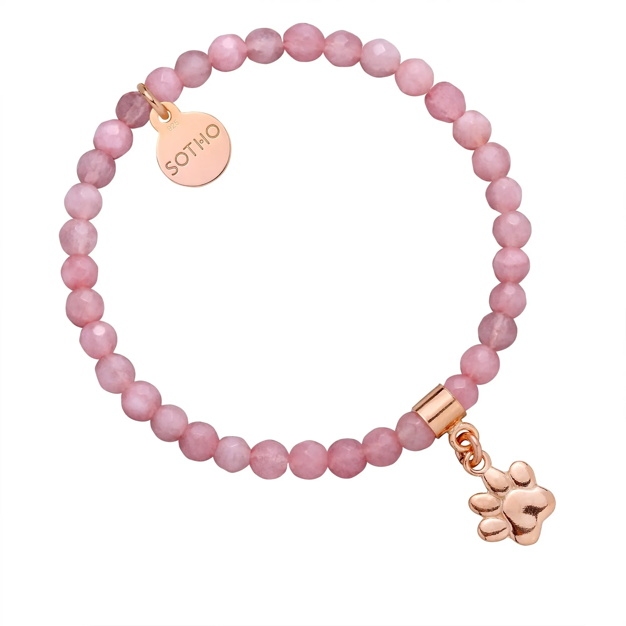 Bransoletka wykonana z jasnoróżowego fasetowanego jadeitu, łapki i zawieszki z logo marki. Wszystkie elementy wykonane ze srebra 925.