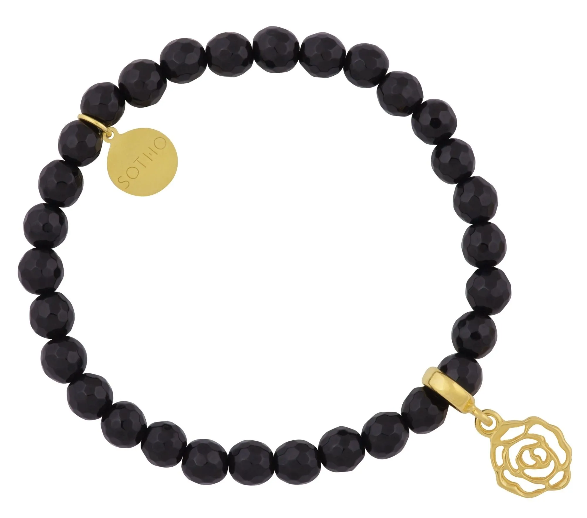 Bransoletka wykonana z jasnoróżowego fasetowanego jadeitu, łapki i zawieszki z logo marki. Wszystkie elementy wykonane ze srebra 925 powlekanego 24 karatowym żółtym złotem.