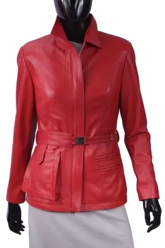 KAM461 – czerwona kurtka damska ze skóry o zwiększonej długości DORJAN
