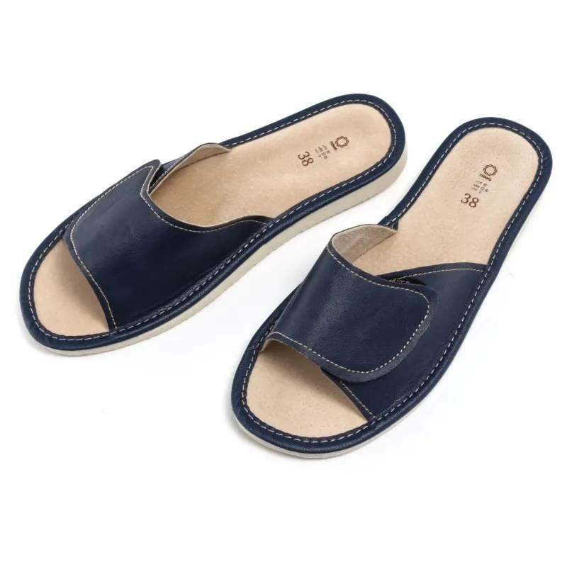 Po ciężkim pracowitym dniu nasze stopy wręcz błagają o chwilę wytchnienia. Znasz to fantastyczne uczucie, kiedy po powrocie do domu zamieniasz ciężkie codzienne buty na lekkie i wygodne kapcie? Charakterystyka: Model: KD-01-DB Materiał zewnętrzny: wysokiej jakości skóra ekologiczna, przyjemna w dotyku i trwała Wkładka: miękka, profilowana i wykonana ze skóry naturalnej dla komfortu i wsparcia stopy Kolor: granatowy Zapięcie na rzep: pozwala na łatwą regulację szerokości – idealne dla stóp o różnych kształtach, również opuchniętych lub szerszych Materiał podeszwy: lekka i elastyczna z pianki EVA lub gumy EVA, zapewniająca antypoślizgowość i stabilność użytkowania domowego Typ: wsuwane, bez zakrytych palców (open-toe), co zapewnia dobrą wentylację i lekkość noszenia Wysokość podeszwy: ok 2 cm podnosi komfort, zapewnia stabilność Wykończenie: solidne przeszycia i estetyczne detale dodają trwałości i schludnego wyglądu Oddychalność: model nie ma ocieplenia, co czyni go idealnym wyborem na cieplejsze dni lub dla osób, które wolą lekkość obuwia Produkcja: Polska Tabela rozmiarów Dopasowanie odpowiedniego rozmiaru obuwia jest trudną sprawą.