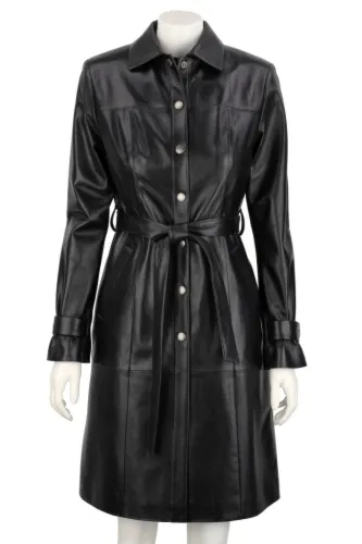 KRND450 - długi czarny płaszcz skórzany damski z paskiem DORJAN