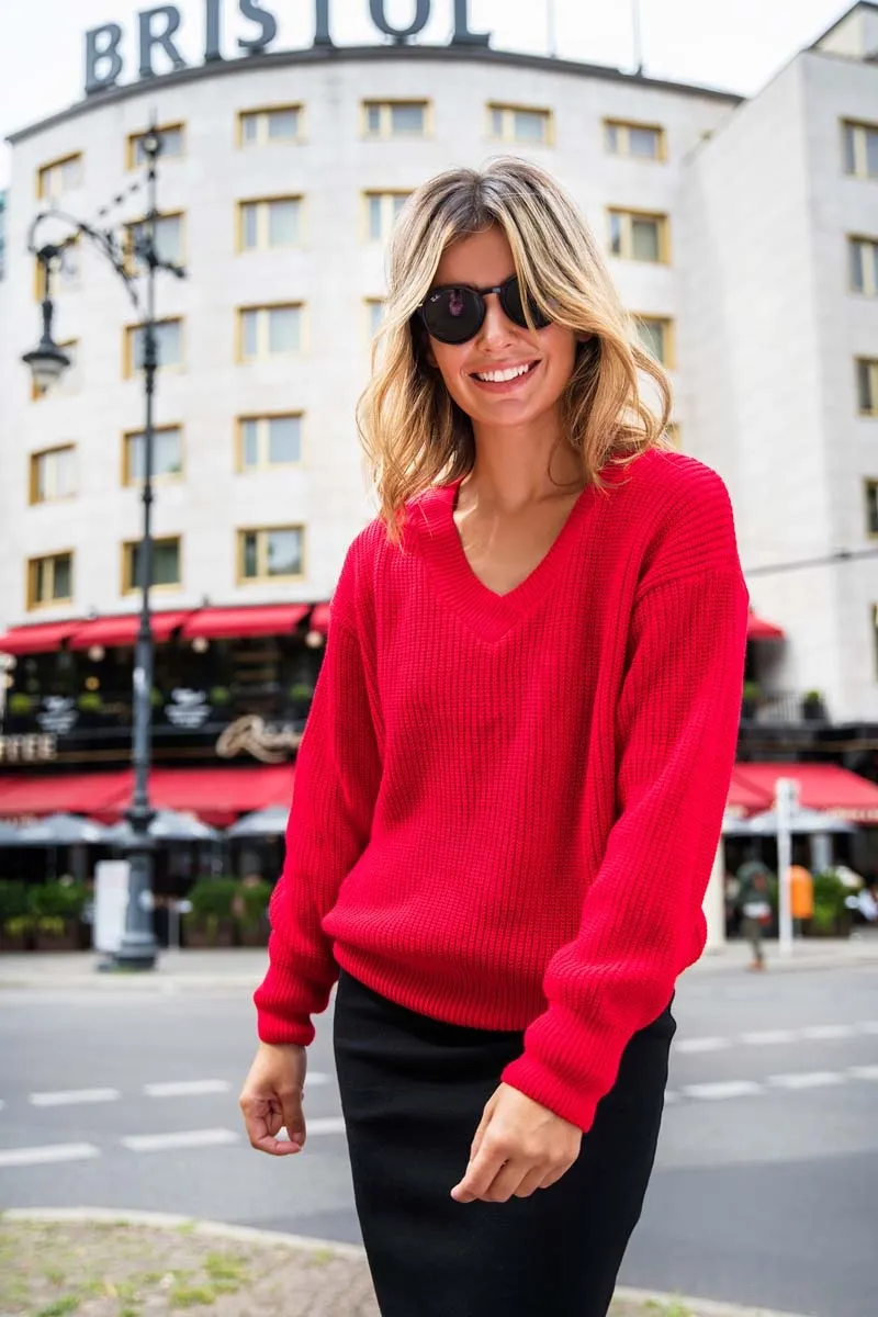 Klasyczny Sweter z Dekoltem w Szpic - Pomarańczowy