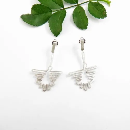 Mniejsza wersja kolczyków piesków z Nazca. Kolczyki wykonane ze srebra. Kolor: biały satynowy. Waga kolczyków 5,5 gr. Długość 4,1 cm. Wymiary pieska 2,2 cm na 2,5 cm.Do kolczyków polecamy wisiorek do kompletu. Nr katalogowy :N6KB