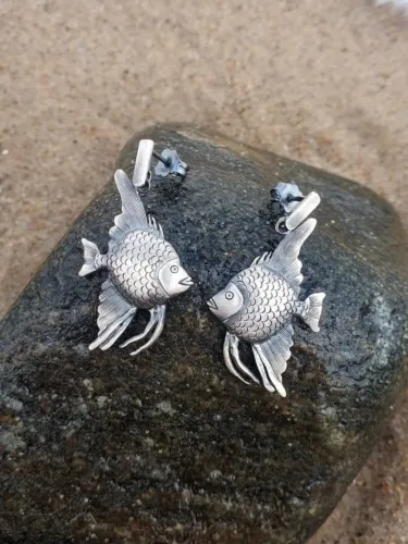 Urocze i zabawne kolczyki w kształcie rybek. Wykonane ze srebra , następnie pozłocone. Długość kolczyków 5 cm, szerokość 2 cm. Waga: 6,4 gr. Nr katalogowy : BS2KZ