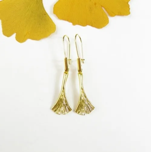 Urocze kolczyki srebrne w kształcie listków miłorzębu. W całości zostały pozłocone. Kolczyki są na sztyftach. Długość 2,5 cm, szerokość 1,3 gr. Waga: 3,2 gr. Kolczyki o smukłej i delikatnej formie, idealne na co dzień. Nr katalogowy :L20KZ