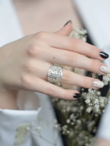 Pierścionek srebrny - Liściasty biały