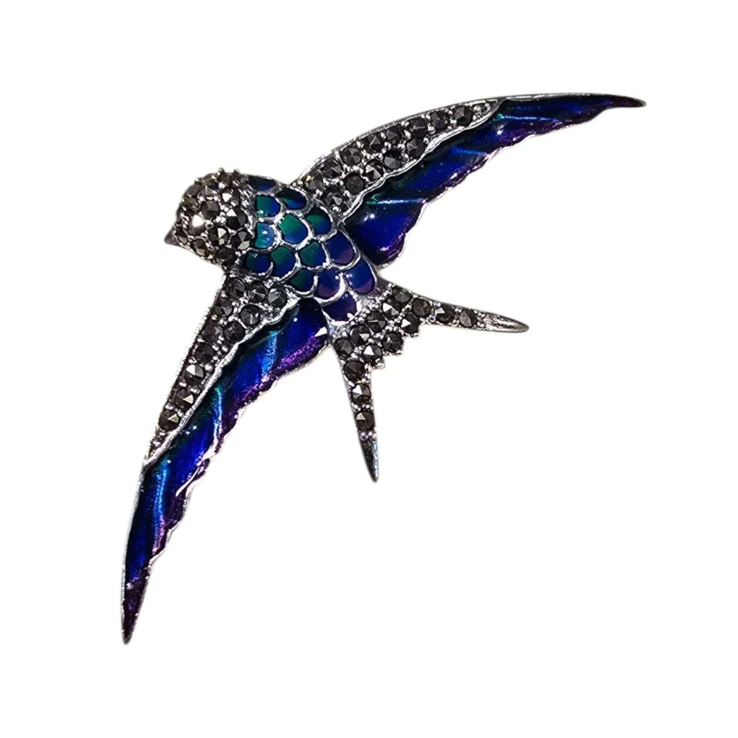 Broszka srebrna z markazytami i kobaltowo- fioletową emalią jaskółka