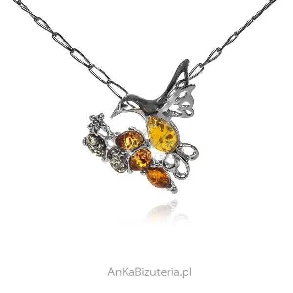 Srebrna zawieszka z bursztynem -ptaszek na gałązce