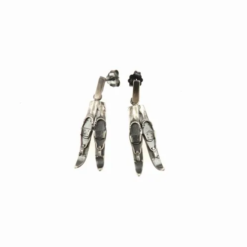 Kolczyki srebrne w kształcie małych nart. Wykonane ze srebra próby 925 następnie. Kolor: biały. Długość samych nart 2,5 cm, długość całkowita kolczyków około 5 cm. Waga: 5 gr. Nr katalogowy :H15KB