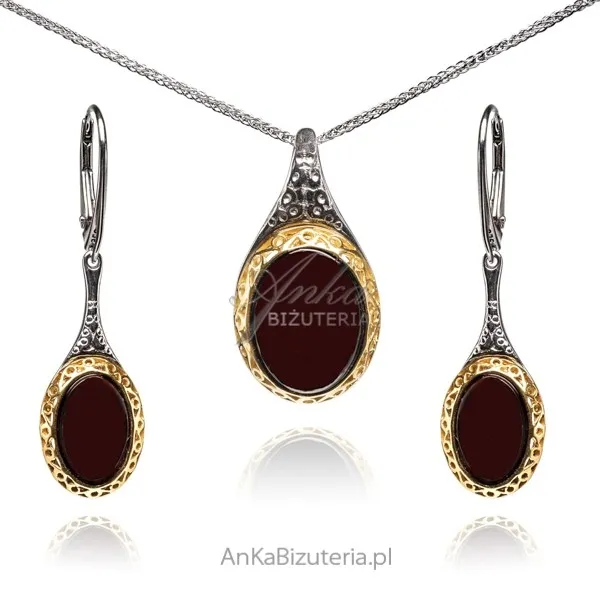 Komplet biżuteria srebrna z wiśniowym bursztynem