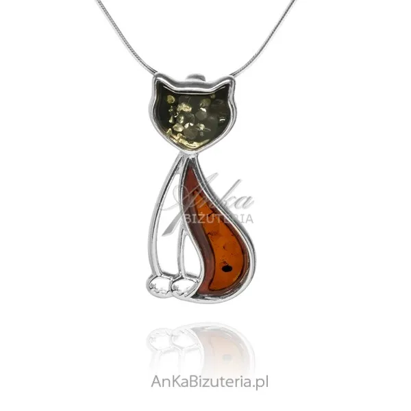 Zawieszka srebrna kotek z bursztynem zielonym i koniakowym