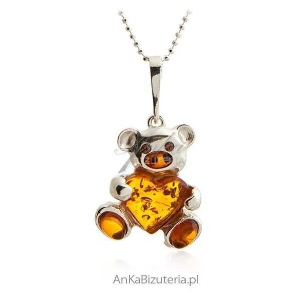 Zawieszka srebrna z bursztynem miś z serduszkiem