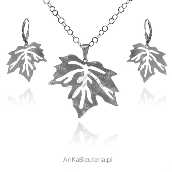 Komplet biżuteria srebrna liść satynowany