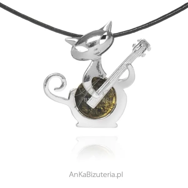 Srebrna zawieszka z zielonym bursztynem kot z gitarą