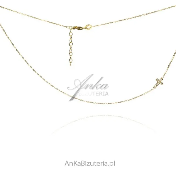 Naszyjnik srebrny pozłacany krzyżyk poprzeczny z cyrkoniami