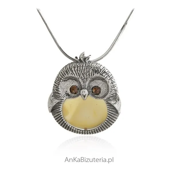 Srebrna zawieszka z bursztynem sówka