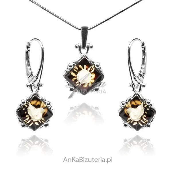Komplet biżuteria srebrna z bursztynem z rzeźbionymi różami