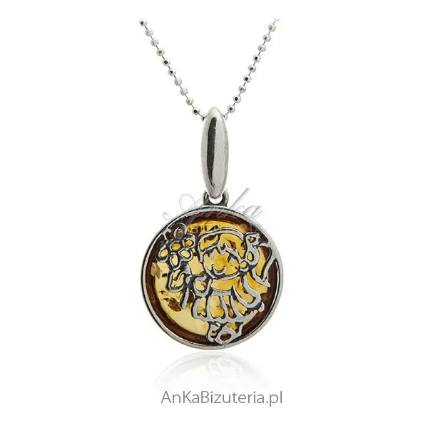 Zawieszka srebrna z bursztynem dziewczynka z kwiatkami