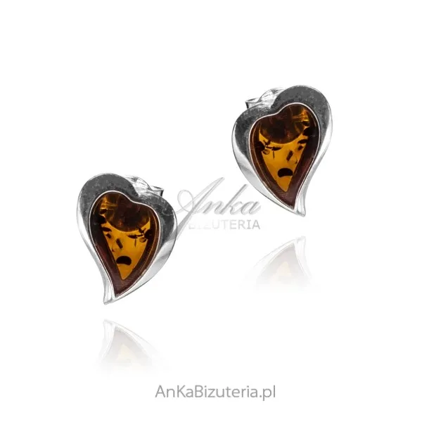 Kolczyki srebrne serduszka z wiśniowym bursztynem