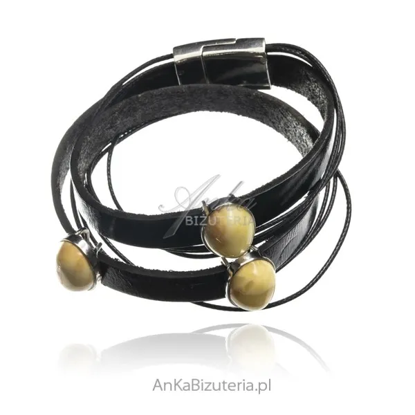 Piękna bransoleta srebrna ze skóry i z bursztynem