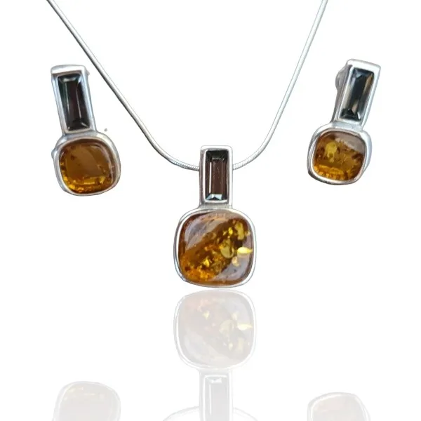 Komplet biżuteria srebrna z bursztynem i kryształem w kolorze grafit