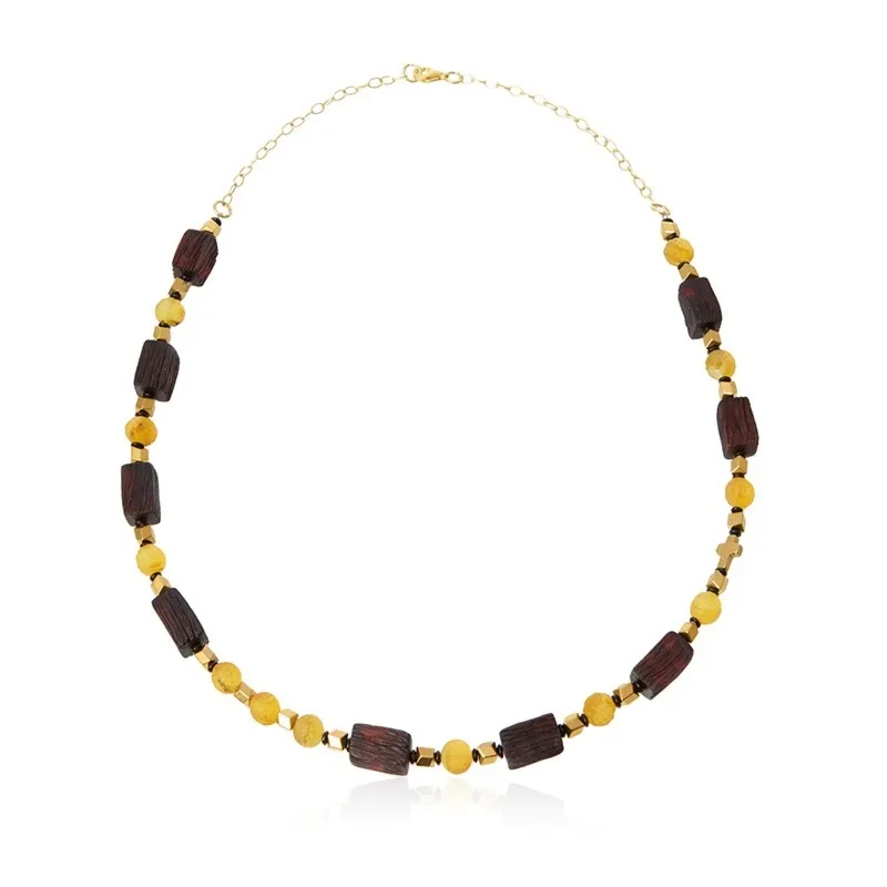 Naszyjnik srebrny pozłacany z pięknymi bursztynami - wiśnia satynowa przecierana, kulka cytrynowa fasetowana