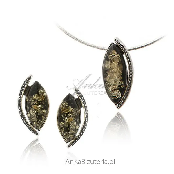 Komplet srebrny z zielonym bursztynem