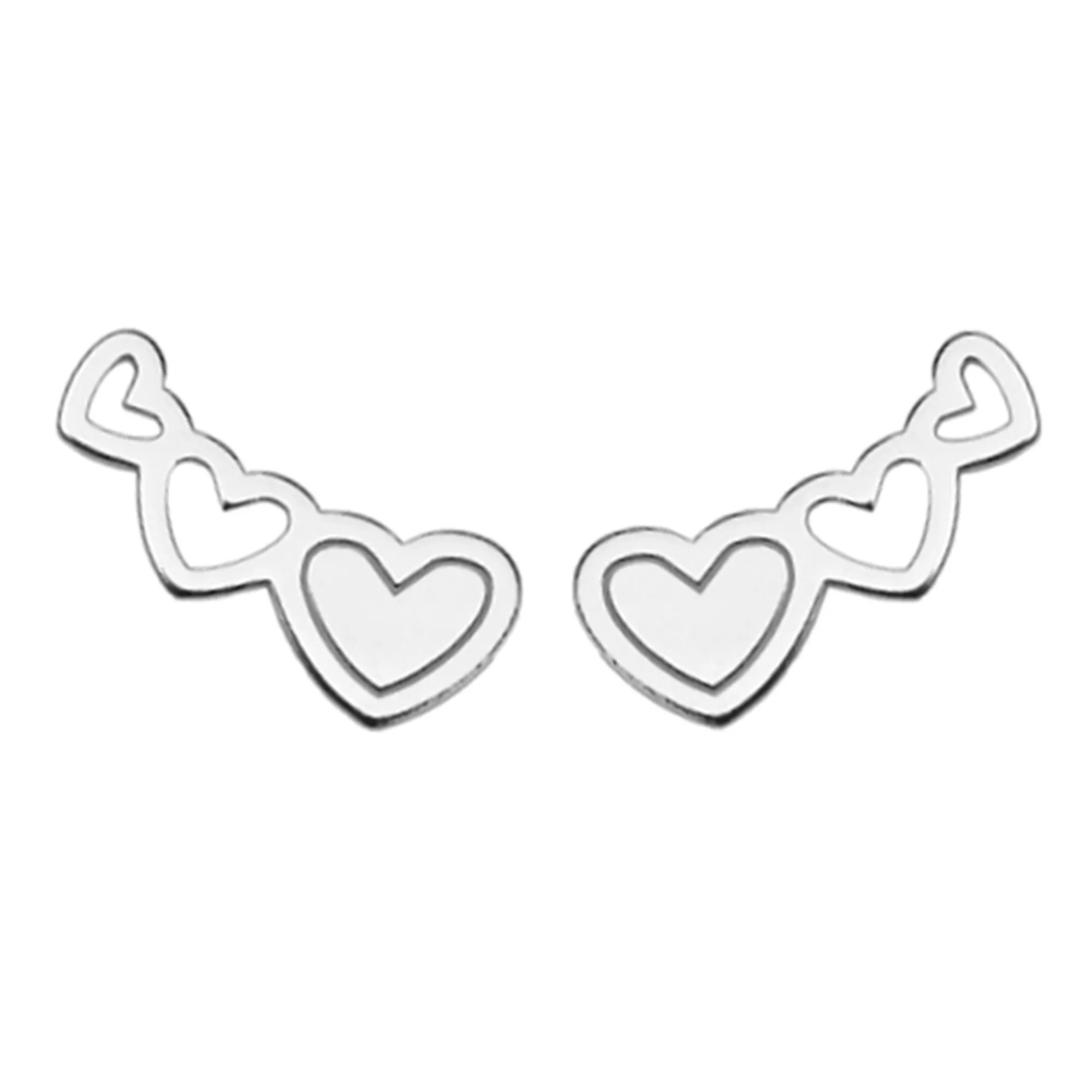 Złote kolczyki w kształcie potrójnych serduszek. Zapinane na sztyft. Para ma lewy i prawy kolczyk. Kolczyki posiadają zapięcia (baranki). Kolczyki w całości wykonane są ze srebra 925 powlekanego 24 karatowym żółtym złotem.