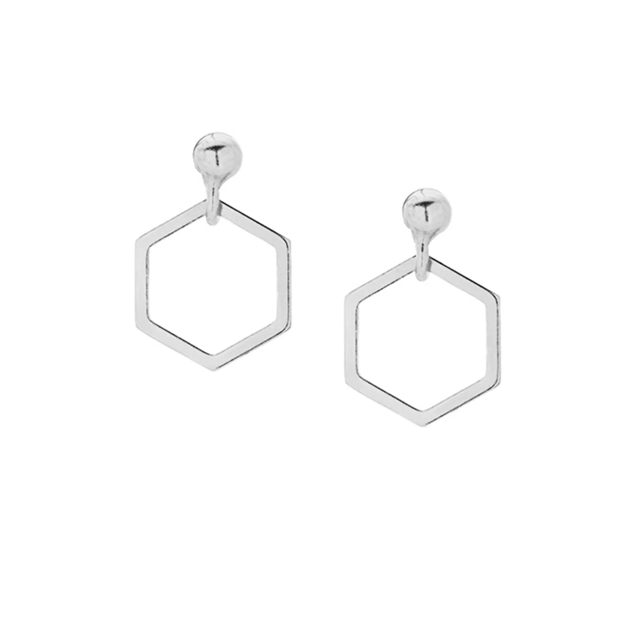 Złote kolczyki z wiszącymi sześciokątami. Całość wykonana ze srebra 925 powlekanego 24 karatowym różowym złotem. Zapinane na sztyft.