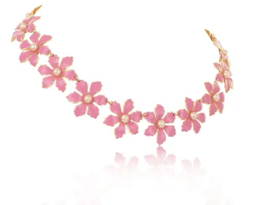Pozłacana kolia z ręcznie malowanymi białymi kwiatami, z różowymi koralikami w środku. Długość elementu ozdobnego 31 cm, długość łańcuszka do regulacji 20 cm.