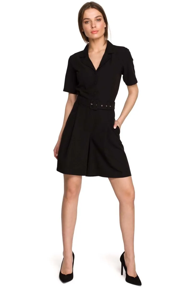 Czarny kombinezon damski z krótkimi nogawkami w zaledwie kilka chwil potrafią wyczarować całą stylizację. Nie musisz martwić się tym, czy spodnie pasują do bluzki. Kombinezony sprawdzają się podczas wielu rozmaitych okazji.Kombinezon jest idealną opcją na randkę z sympatią, a nawet wyjście z koleżankami. Wyróżnia się dopasowaną górą z kołnierzykiem i dekoltem V, który doskonale sprawdzi się u pań, które chcą optycznie wysmuklić górną część ciała oraz wydłużyć szyję. Szerokie spodnie sięgają do połowy uda i świetnie układają się na sylwetce. Pasek z klamrą w talii podkreśla szykowny i elegancki wygląd kombinezonu. Kombinezon zestaw z parą klasycznych szpilek, a uzyskasz nietuzinkową stylizację pełną klasy i elegancji.Modelka ma 174 cm wzrostu i nosi rozmiar SMateriał: 65% poliester 30% wiskoza 5% elastan