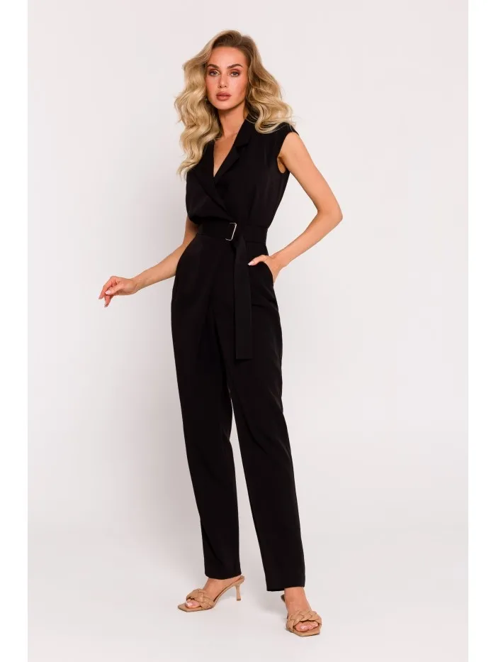 Przedstawiamy czarny kombinezon jednoczęściowy, który łączy w sobie wyrafinowany styl z wygodą noszenia, idealny na wiele okazji. Wykonany z wysokiej jakości tkaniny, ten kombinezon wyróżnia się elegancją i subtelnością. Nogawki zwężane ku dołowi z ozdobną asymetrią po boku dodają mu charakteru i wyjątkowego wyglądu. Góra kombinezonu, w stylu kopertowym bez rękawów, posiada kołnierz i dekolt w kształcie litery V, co podkreśla kobiecą sylwetkę. W talii z przodu znajduje się zapięcie na mini napki i kryty zamek rozporkowy, zapewniający łatwe zakładanie i zdejmowanie kombinezonu. Tył talii wyposażony jest w elastyczną taśmę, co gwarantuje odpowiednie dopasowanie do sylwetki. Dodatkowo, kombinezon posiada praktyczne boczne kieszenie, które są zarówno funkcjonalne, jak i dodają charakteru całej stylizacji. Do kombinezonu dołączony jest także pasek z klamrą, który można dopasować do swoich preferencji.