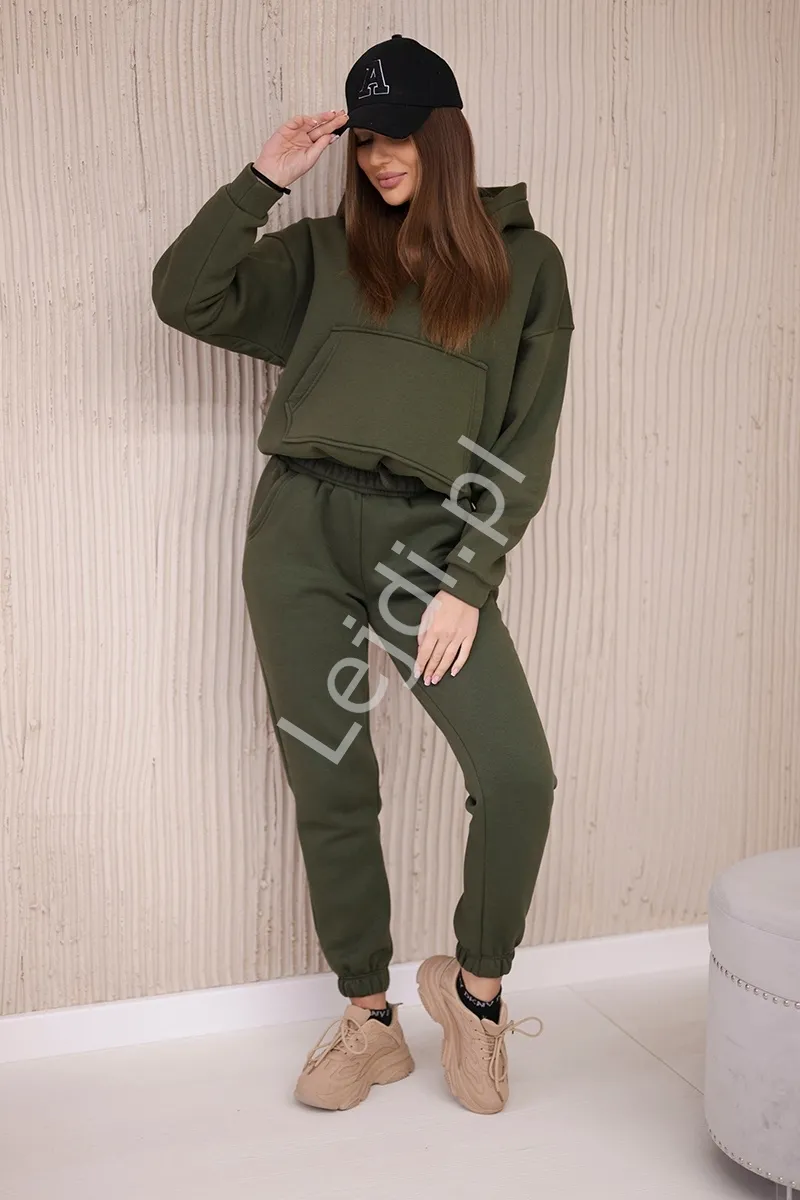 Komplet dresowy ocieplany z wiązaniem na dole khaki 816