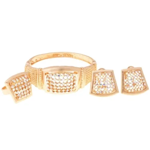 Komplet pozłacany, bardzo ozdobny. Duży ażurowy prostokąt z kolorowymi cyrkoniami. W komplecie łańcuszek, sztywna bransoletka, kolczyki oraz pierścionek. Stal szlachetna pozłacana. Gwarancja pozłocenia i jakości. Warstwa złota naniesiona w metodzie – PVD- napylanie próżniowe jonami tytanu, czy też azotkiem tytanu jest nowoczesną metodą nanoszenia powłok o bardzo dużej trwałości. * Pokryte jest w całości 4 – 8 mikronową warstwą 14K, 18K i 24K złota. * Warstwa złocenia pokryta jest lakierem jubilerskim, który zabezpiecza powłokę złota przed ścieraniem i nadaje wspaniały połysk * Biżuteria wykonana ze stali szlachetnej-należy do grupy stali o strukturze austenitycznej ( podobna chirurgiczna 316 L) : – jest hipoalergiczna i nie uczula, ponieważ nie emituje związków niklu do organizmu – nie koroduje, nie odbarwia się i długo cieszy swoim blaskiem – ścieralność uzależniona od noszenia i od pH ciała – nie wymaga specjalnej konserwacji jak biżuteria ze srebra, czy złota Ze względu na różne ustawienia monitorów oraz różną jakość wyświetlaczy zastosowanych w urządzeniach mobilnych, kolory przedstawione na zdjęciach mogą nieznacznie różnić się od rzeczywistych.