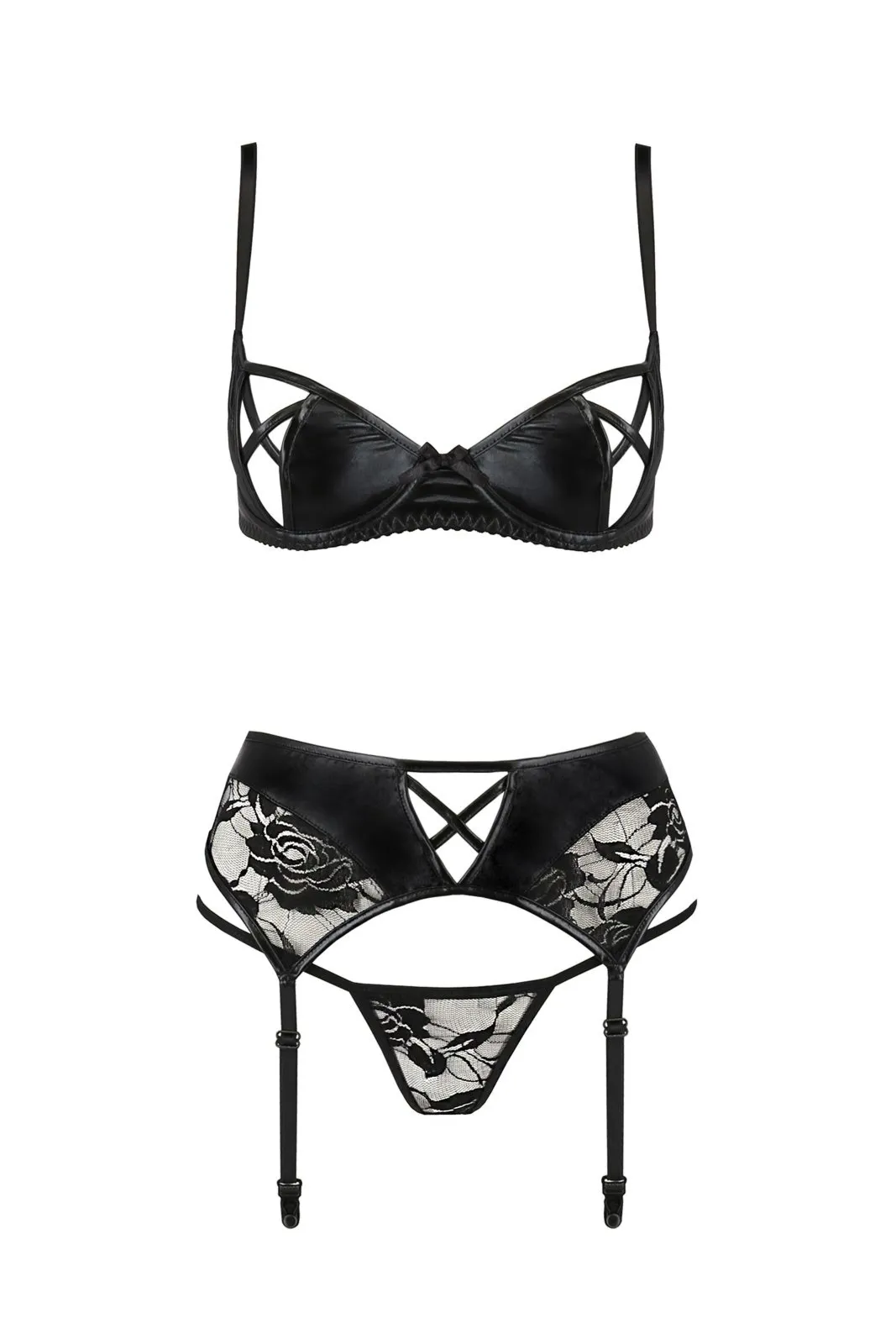 Trzyczęściowy komplet, na który składają się biustonosz, pas do pończoch oraz stringi, rozbudzi zmysły do szaleństwa. Biustonosz wzmocniony fiszbinami pięknie eksponuje walory kobiety, a regulowane ramiączka i zapięcie na haftkę świetnie wpływają na samopoczucie i wygodę.