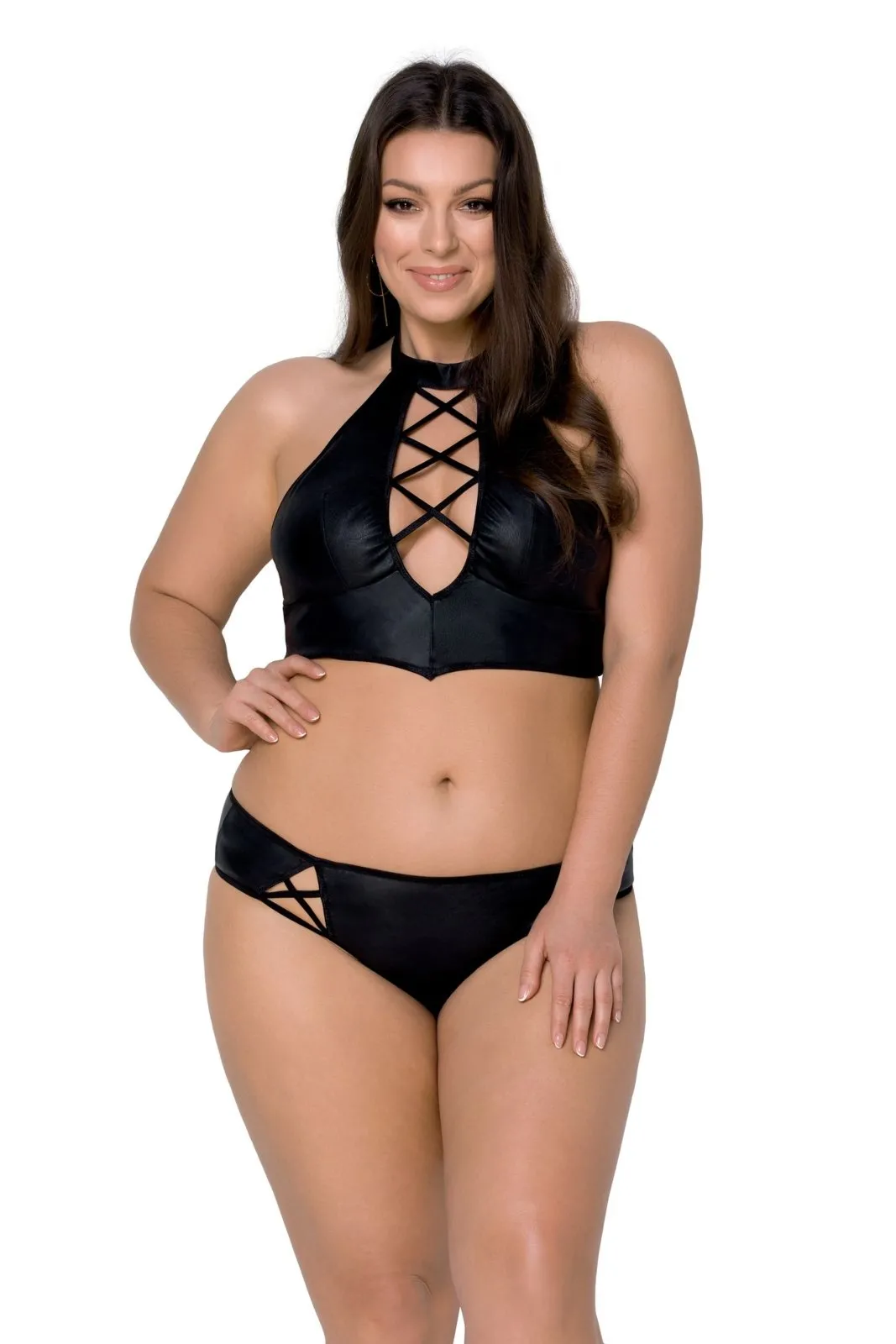 Malwia to komplet składający się ze skórzanego topu zapinanego na szyje z ozdobnymi napami oraz sznurowaniem, które podkreśla i uwydatnia biust oraz majtek typu stringi z uroczym wycięciem. Ozdobne łączenia w postaci kółek, nadają osobliwego uroku.