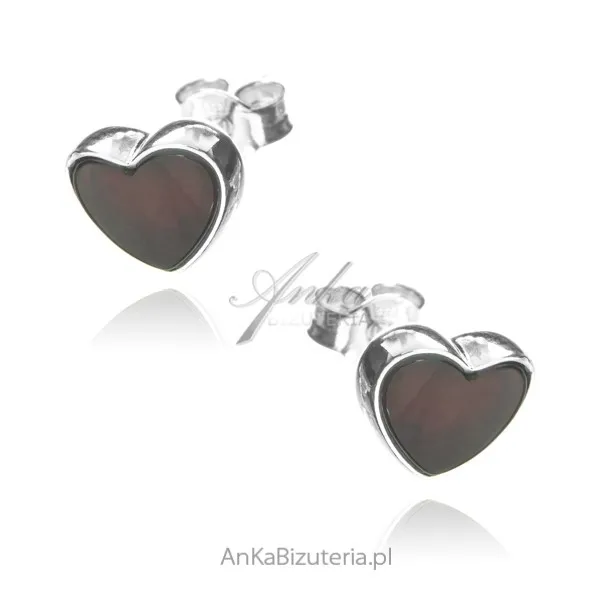 Kolczyki srebrne serduszka z wiśniowym bursztynem