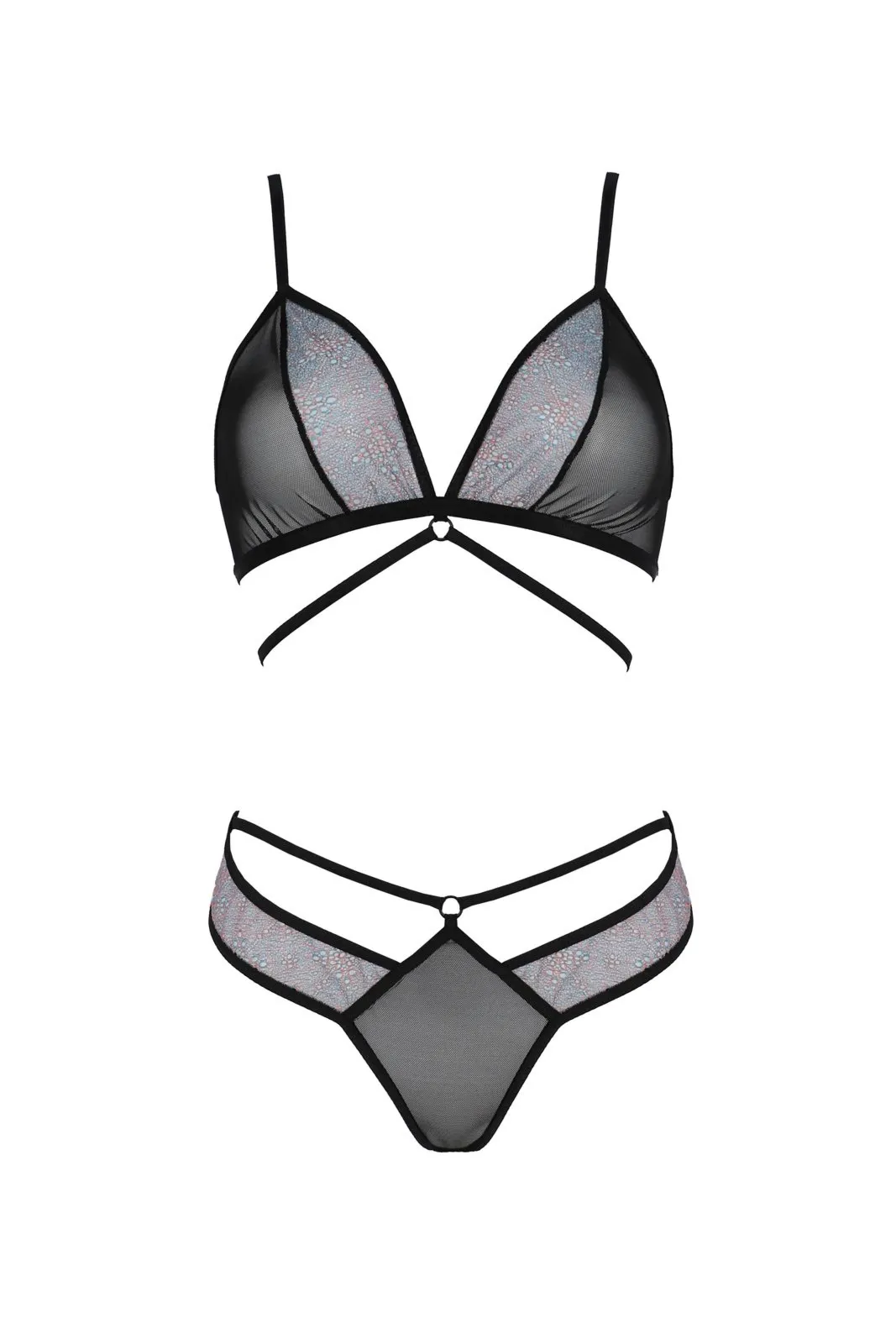 Mamy dla Ciebie coś wyjątkowego – biustonosz z paseczkami na dekolcie obszyty niebieską koronką, z regulowanymi ramiączkami i zapięciem w tyle, a także koronkowe, czarne stringi z krzyżującymi się paskami, dzięki którym wyglądają jeszcze ciekawiej.
