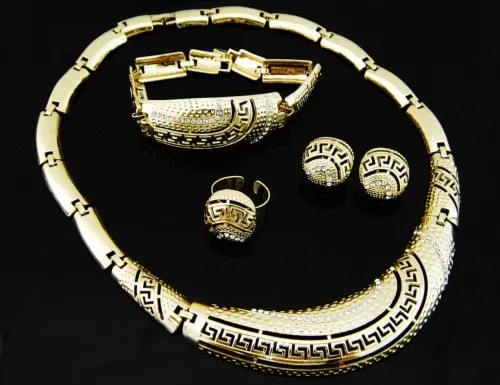 wymiary : kolia – 44 cm kolczyki – 1,7 cm * 1,8 cm bransoletka – 19,5 cm * 2,7 cm pierścionek – regulowany . * Warstwa złota naniesiona w metodzie electroplated * Pokryte jest w całości 4 – 8 mikronową warstwą 14K i 18K złota * Warstwa złocenia pokryta jest lakierem jubilerskim który zabezpiecza powłokę złota przed ścieraniem i nadaje wspaniały połysk * Biżuteria wykonana ze stali szlachetnej-należy do grupy stali o strukturze austenitycznej (t.j.chirurgiczna 316 L) : – jest hipoalergiczna i nie uczula,ponieważ nie emituje związków nicklu do organizmu – nie koroduje,nie odbarwia się i długo cieszy swoim blaskiem – ścieralność uzależniona od noszenia i od pH ciała – nie wymaga specjalnej konserwacji jak biżuteria ze srebra,czy złota