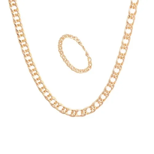 Komplet pozłacany, gęsty splot ogniw. Wymiary: łańcuszek ( 22,0 x 0,4 cm), bransoletka ( 20,5 x 0,4 ). Warstwa złota naniesiona w metodzie – PVD- napylanie próżniowe jonami tytanu, czy też azotkiem tytanu jest nowoczesną metodą nanoszenia powłok o bardzo dużej trwałości. * Pokryte jest w całości 4 – 8 mikronową warstwą 14K, 18K i 24K złota. * Warstwa złocenia pokryta jest lakierem jubilerskim, który zabezpiecza powłokę złota przed ścieraniem i nadaje wspaniały połysk * Biżuteria wykonana ze stali szlachetnej-należy do grupy stali o strukturze austenitycznej ( podobna chirurgiczna 316 L) : – jest hipoalergiczna i nie uczula, ponieważ nie emituje związków niklu do organizmu – nie koroduje, nie odbarwia się i długo cieszy swoim blaskiem – ścieralność uzależniona od noszenia i od pH ciała – nie wymaga specjalnej konserwacji jak biżuteria ze srebra, czy złota Ze względu na różne ustawienia monitorów oraz różną jakość wyświetlaczy zastosowanych w urządzeniach mobilnych, kolory przedstawione na zdjęciach mogą nieznacznie różnić się od rzeczywistych.