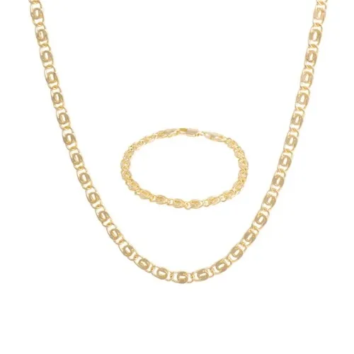 Komplet pozłacany, płaski, spleciony kłos. Wymiary: łańcuszek ( 21,5 x 0,5 cm), bransoletka ( 20,0 x 0,5 ). Warstwa złota naniesiona w metodzie – PVD- napylanie próżniowe jonami tytanu, czy też azotkiem tytanu jest nowoczesną metodą nanoszenia powłok o bardzo dużej trwałości. * Pokryte jest w całości 4 – 8 mikronową warstwą 14K, 18K i 24K złota. * Warstwa złocenia pokryta jest lakierem jubilerskim, który zabezpiecza powłokę złota przed ścieraniem i nadaje wspaniały połysk * Biżuteria wykonana ze stali szlachetnej-należy do grupy stali o strukturze austenitycznej ( podobna chirurgiczna 316 L) : – jest hipoalergiczna i nie uczula, ponieważ nie emituje związków niklu do organizmu – nie koroduje, nie odbarwia się i długo cieszy swoim blaskiem – ścieralność uzależniona od noszenia i od pH ciała – nie wymaga specjalnej konserwacji jak biżuteria ze srebra, czy złota Ze względu na różne ustawienia monitorów oraz różną jakość wyświetlaczy zastosowanych w urządzeniach mobilnych, kolory przedstawione na zdjęciach mogą nieznacznie różnić się od rzeczywistych.