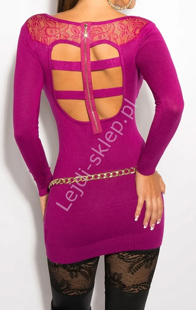 Fuksjowa sukienka z koronką na plecach i paskami, 8031