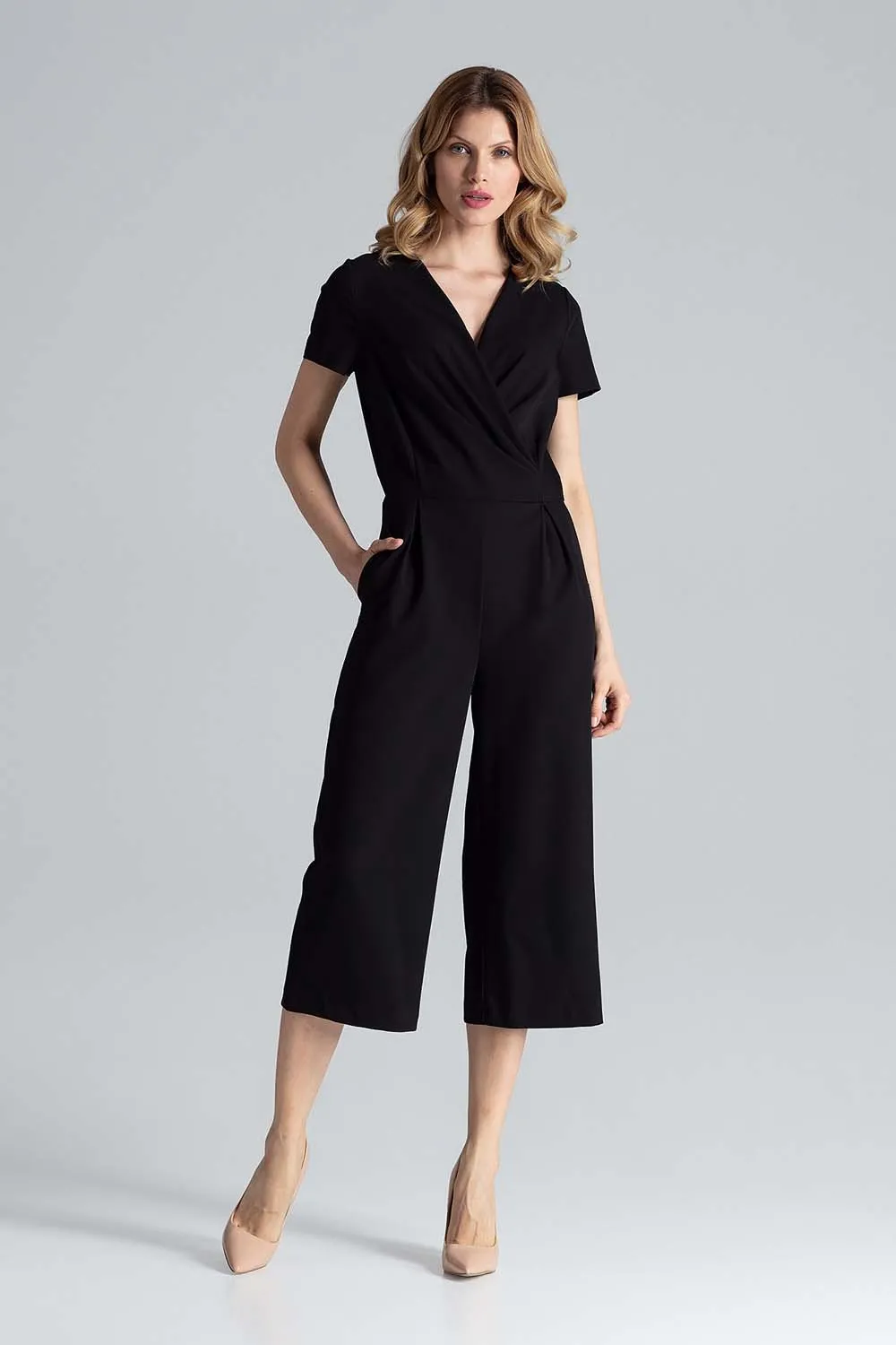 Czarny Kombinezon z Szerokimi Nogawkami 7/8 z Kopertowym Dekoltem