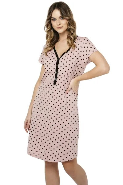 Pudrowa koszula w czarne grochy to ponadczasowy krój w połączeniu z najlepszej jakości bawełną jersey. Wygodna i przyjemnie otulająca ciało bielizna nocna nawiązuje do mody lat 50 i 60, kiedy to za sprawą Brigitte Bardot Panie oszalały na punkcie tego wzoru. Ten trend utrzymuje się do dzisiaj i zdecydowanie trafia w gust fanek klasycznego stylu.Cechy charakterystyczne:• 100% bawełna jersey• Luźny krój• Dekolt w serek• Zapięcie na napy…