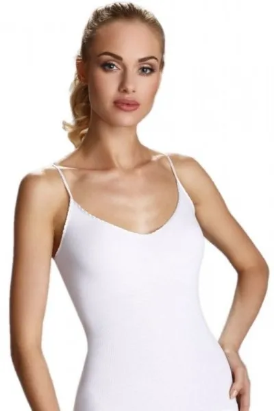 Koszulka damska na wąskich ramiączkach. Wykonana z wysokiej jakości materiału. Dekolt zdobi efektowna koronka.Skład: 80% poliester, 13% poliamid, 7% elastan…