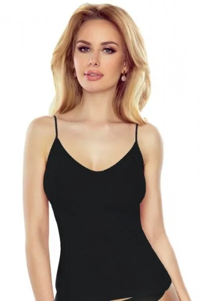 Koszulka wykonana z czystej bawełny na wąskim ramiączku. Dekolt obszyty satynową lamówką. Wygodna i delikatna w dotyku. Dyskretne, niewyczuwalne wykończenia…